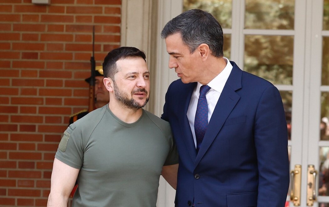 El presidente del Gobierno, Pedro Sánchez, ha recibido al presidente de Ucrania, Volodímir Zelenski, en el Palacio de la Moncloa. Ambos han mantenido un encuentro tras el que Pedro Sánchez ha anunciado la donación para Ucrania de 1.129 millones de euros para armamento, en virtud del acuerdo de seguridad firmado con su homólogo ucraniano.