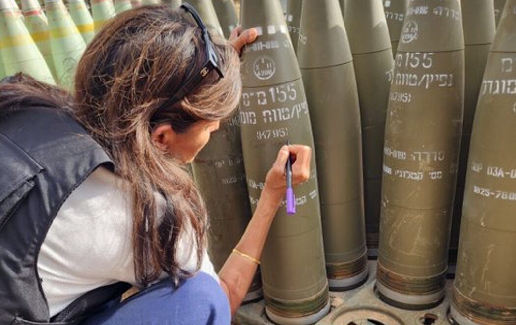 Durante una visita a un puesto de las Fuerzas de Defensa de Israel (FDI) Haley se ha fotografiado escribiendo un mensaje con rotulador sobre uno de los proyectiles empleados en la incursión preparados para ir dirigidos contra el grupo Hezbolá.