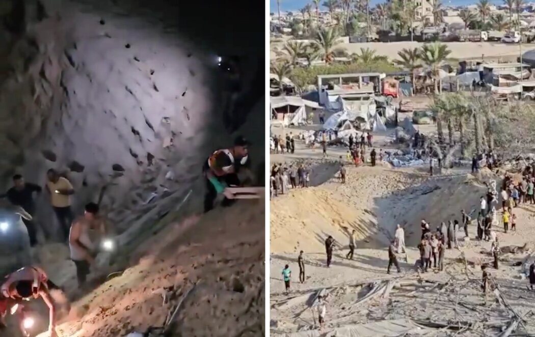 Las imágenes que han difundido los equipos muestran a los rescatistas excavando entre la arena para intentar extraer los cuerpos de los fallecidos o supervivientes. Israel se ha defendido argumentando que en la zona hay presencias de miembros de Hamás, una afirmación que ha negado el grupo islamista.