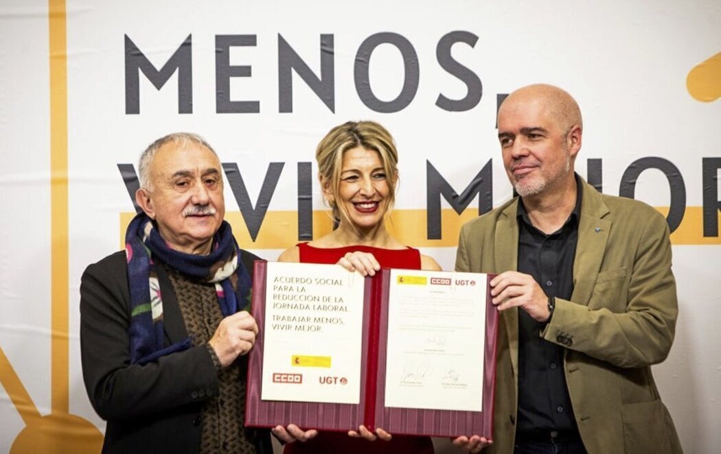 La vicepresidenta segunda del Gobierno y ministra de Trabajo, Yolanda Díaz, ha escenificado el pacto firmado con los sindicatos para la reducción de la jornada laboral a 37,5 horas semanales sin recortes en el salario de los trabajadores.