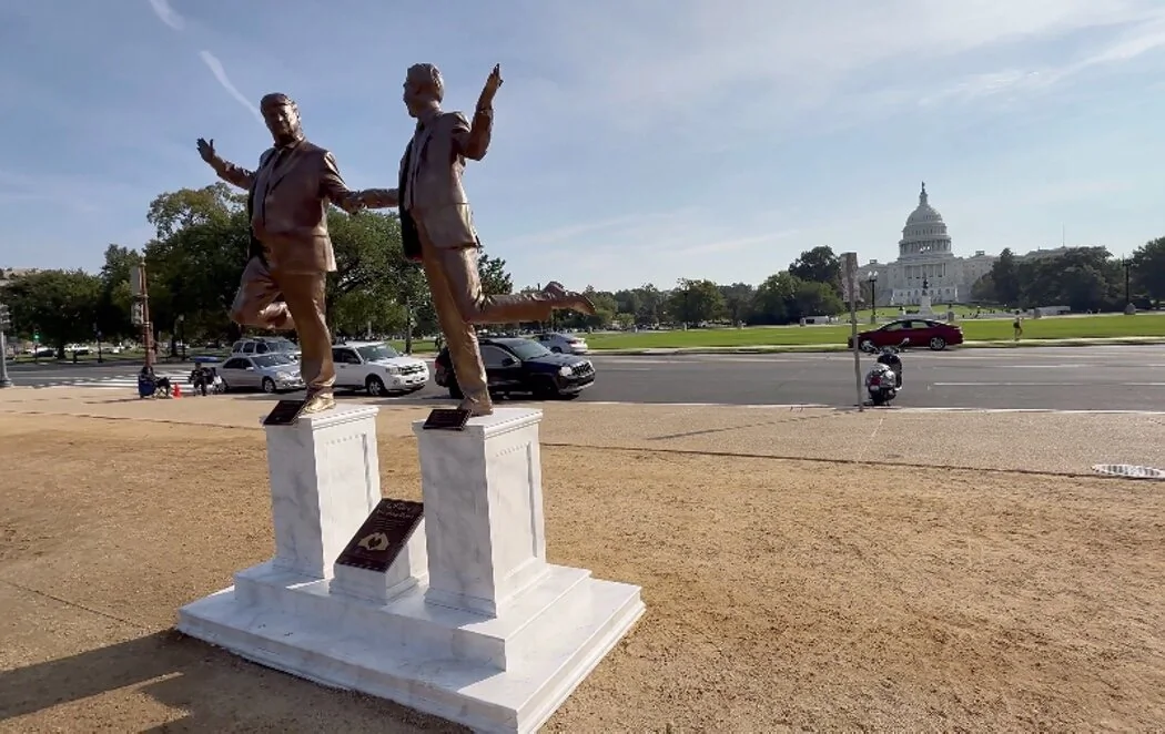 Sorpresa ante el Capitolio de Estados Unidos, en el parque de la Explanada Nacional de Washington D.C., donde ha aparecido una polémica estatua. En ella, se aprecia al presidente de Estados Unidos, Donald Trump, enlazando su mano y dando saltos de alegría junto al ex magnate y delincuente sexual Jeffrey Epstein, una figura de bronce reivindicada por un grupo artístico llamado 'El apretón de manos secreto'.