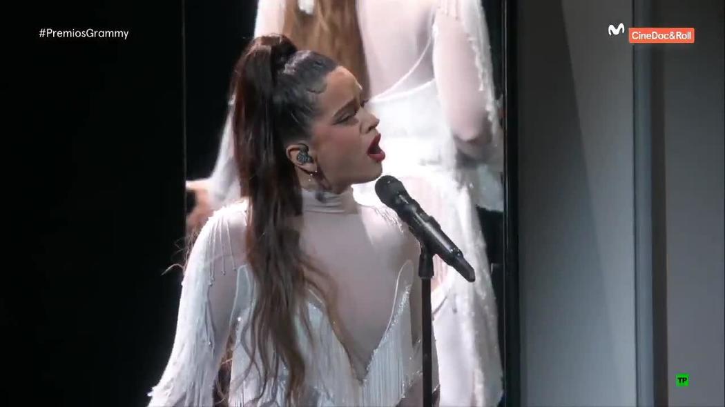 Durante su espectáculo deslumbró regalando una de las actuaciones con más fuerza y garra que se vieron durante la gala. Un perfecto homenaje al flamenco y a la fusión urbana de la que Rosalía ha hecho su sello personal. La catalana empezó su presentación interpretando su nuevo tema, 'Juro que', acompañada de palmas y guitarras flamencas. A continuación, sorprendió con una enérgica coreografía diseñada con trucos de blancos y negros, de sombras y luces. Y tras dejar atónitos a los presentes, Rosalía interpretó 'Malamente', el tema que le dio proyección internacional y que la ha llevado a triunfar en escenarios de medio mundo.