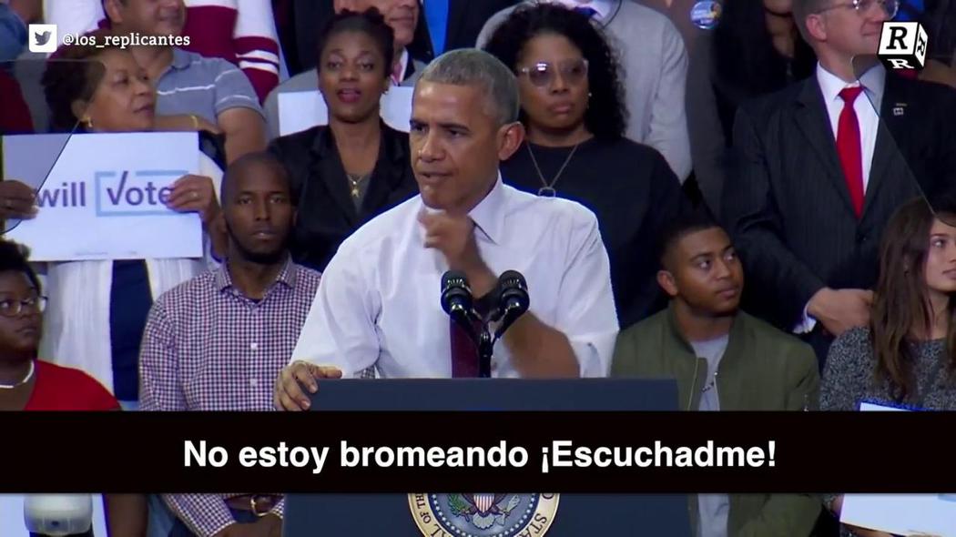 El todavía Presidente de los Estados Unidos, Barack Obama, da una lección de alta política al responder a un votante de Donald Trump que le interrumpe mientras estaba dando un mitin. "Don't boo, vote!".